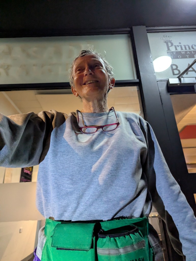 The Contessa herded us outside the Prince of Wales for a chalk talk: follow the chalk exactly, do not walk on the other side of the road, cross only where the arrows cross, do exactly as I say. As bossy as a drill sergeant! Although, when she later popped up on trail to chastise Bee’s Dick for not following trail, she might have been more like a terrier masquerading as a drill sergeant.
