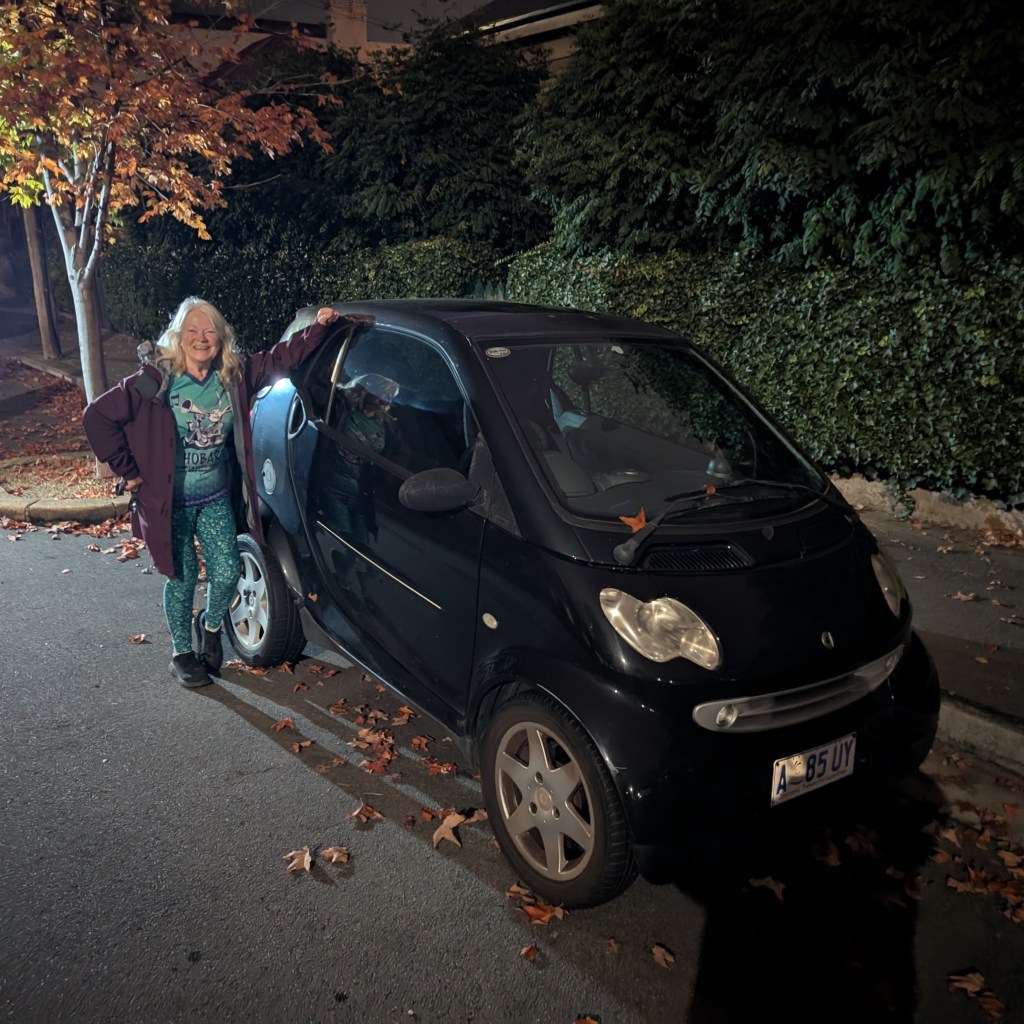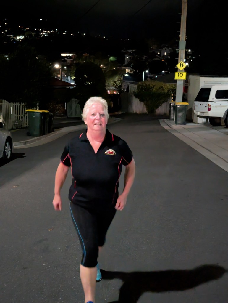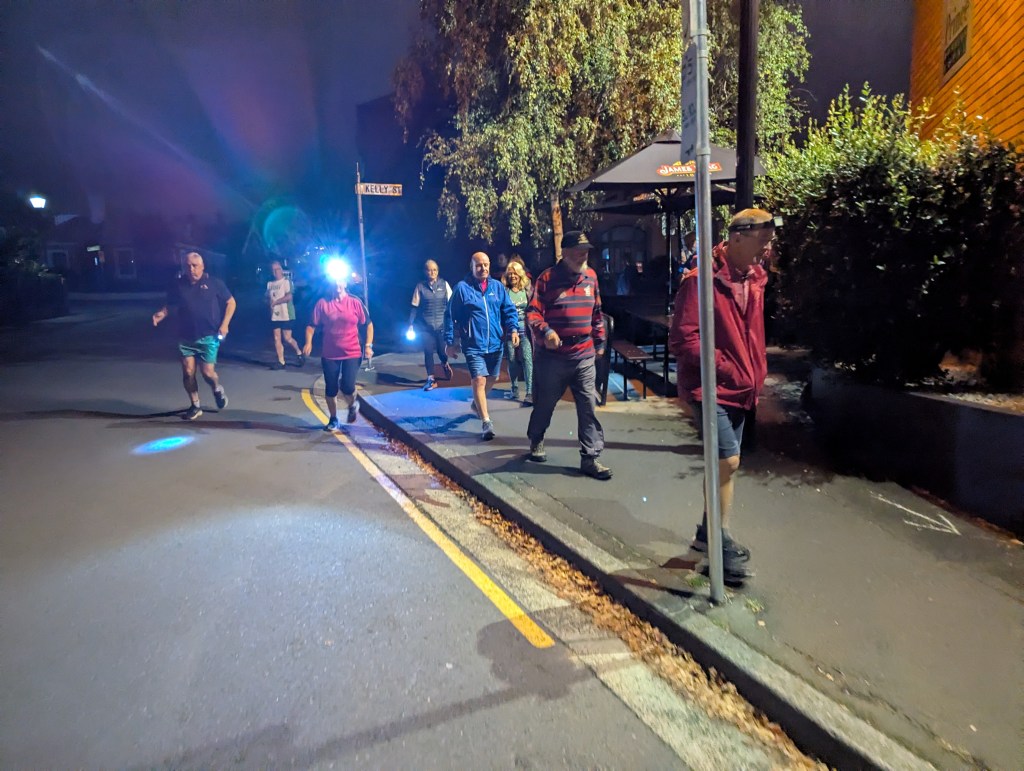 The walkers fragmented into a number of smaller groups along trail; NFI where the runners went. At one point Stunned Mullet, finding himself alone after detouring for a loo break in his gym, jumped on a scooter to catch up with someone … anyone … who would be his friend. The rain didn’t come, the city lights twinkled, trail was carefully planned, and big chalk arrows were impossible to miss. Well done, Contessa Coupla Weeks.