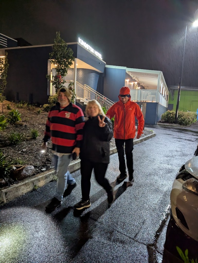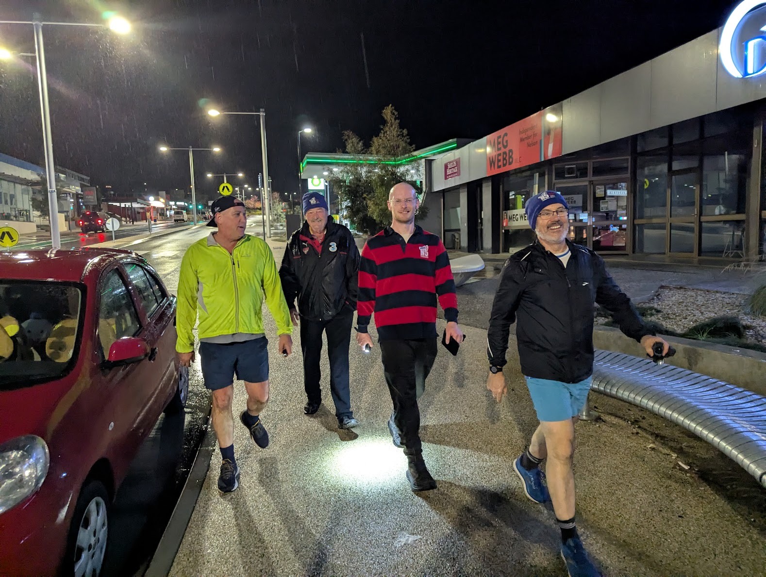 Some walkers made an effort to stay out on a walk for most of the hour. Not the best of nights for doing a Hash Trail. Need more markings in the wet and good torches.