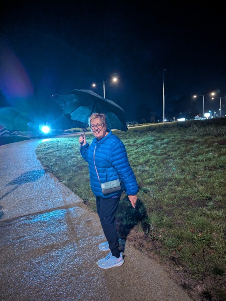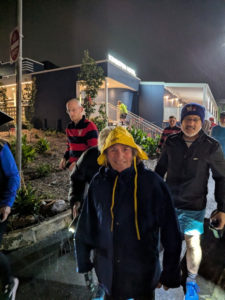 As we congregated, quick look at the menu, go to order and grab a beer – No! Not allowed to order, they would come and take the order. So go and grab a beer. I must say the renovations do look good, but it does make the sound very noisy. Eventually most has ordered and paid. 6.30 was here and were were regrouped outside, all in coats and some with brollys. Lone Arranger was quite miffed as hers had disappeared with the man that says it never rains on a Hash Run!
