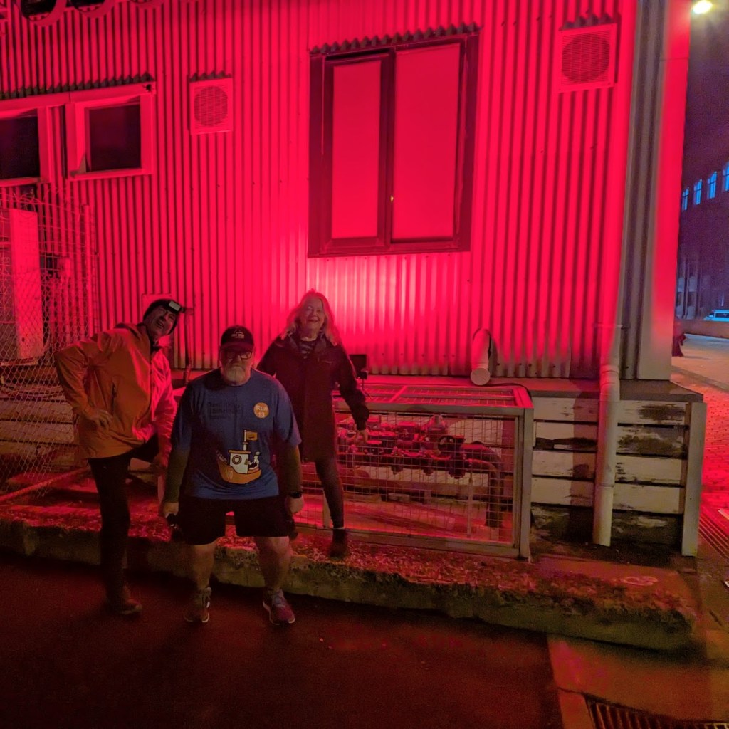 A couple of Dead rabbits on the trail here, then down to Evans Street and around to Franklin Wharf. Lots of building lit up with red lights, everything was quite bright.