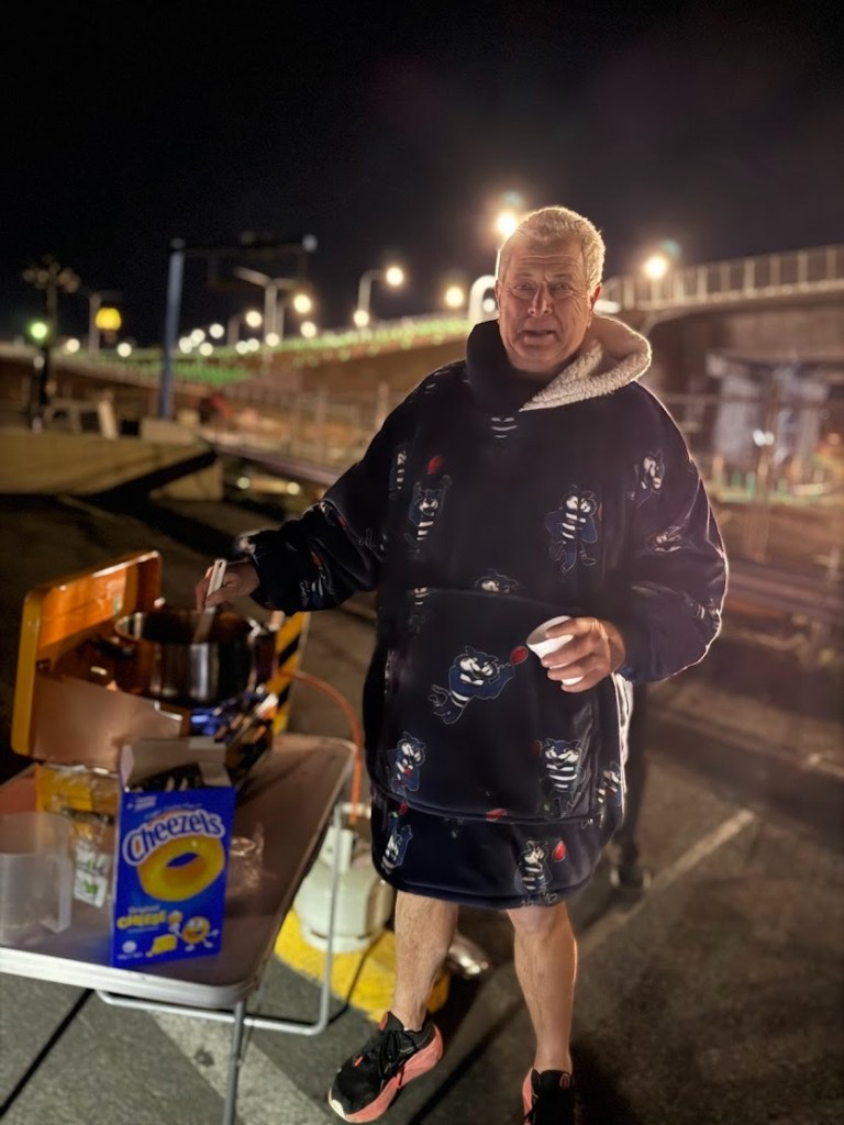 As we crossed the old Lift Span of the soon to be dismantled Old Bridgewater Bridge, who was there to greet us in the middle of the road? None other but In the Raw with an allegedly championship winning gluhwein Piss Stop.