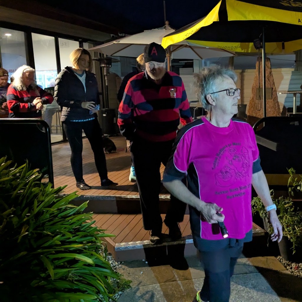 Now the Hares were just being outright Barstools (edited) as we went from the lowest point to the highest point non stop. Steps and a horrible Jindabyne Rd all the way to a trail split at the water tank. Walkers went down towards Auburn Rd and Beach RD from here. After nearly 6km on the walk at 6.35pm the indication of the Piss Stop appeared. As I was only about 15m from the venue at this time, I went there instead.