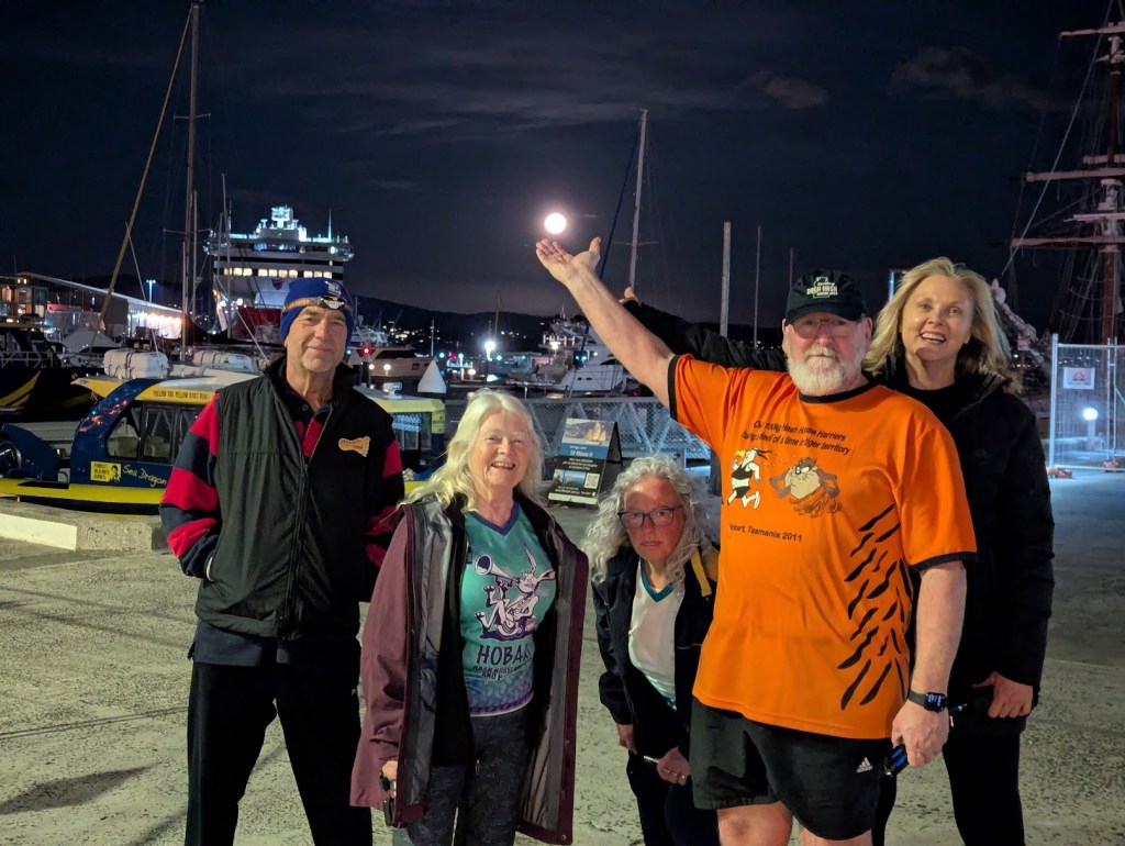 Down Finlay St to the Shore and the Moon was full and rising above the Eastern Shore. A lot of photos were taken of the moon tonight. Around the CSIRO and then basically all around the Docks to virtually under the Spirit of Tasmania IV. More Photos.
